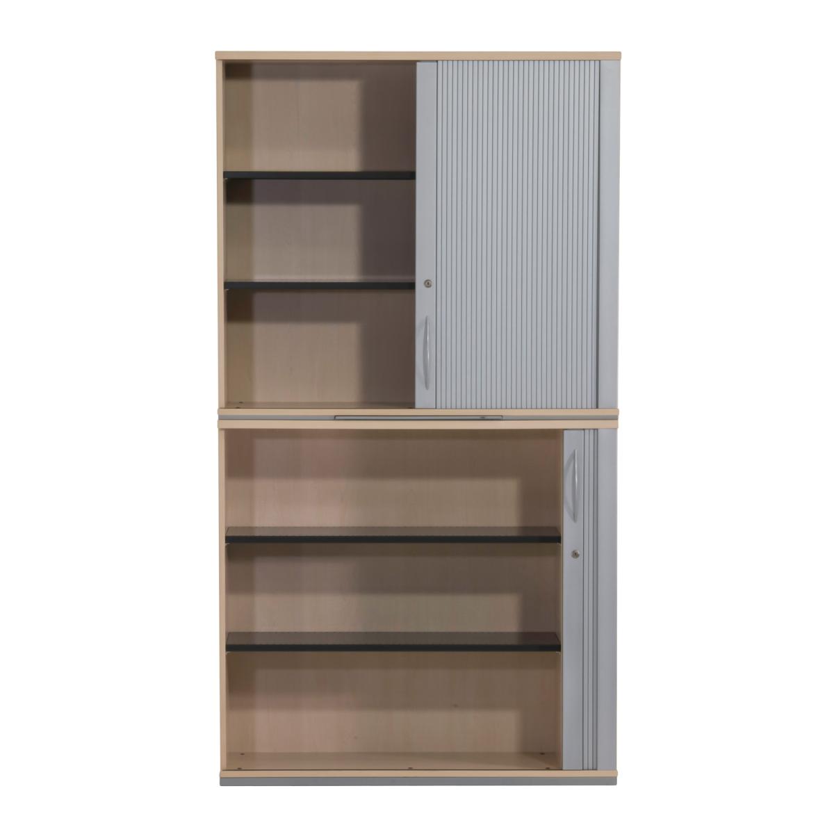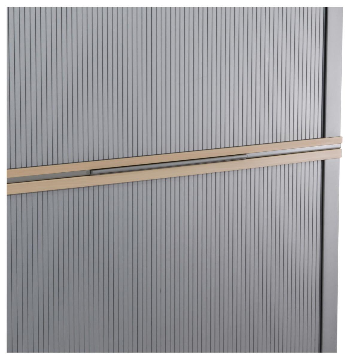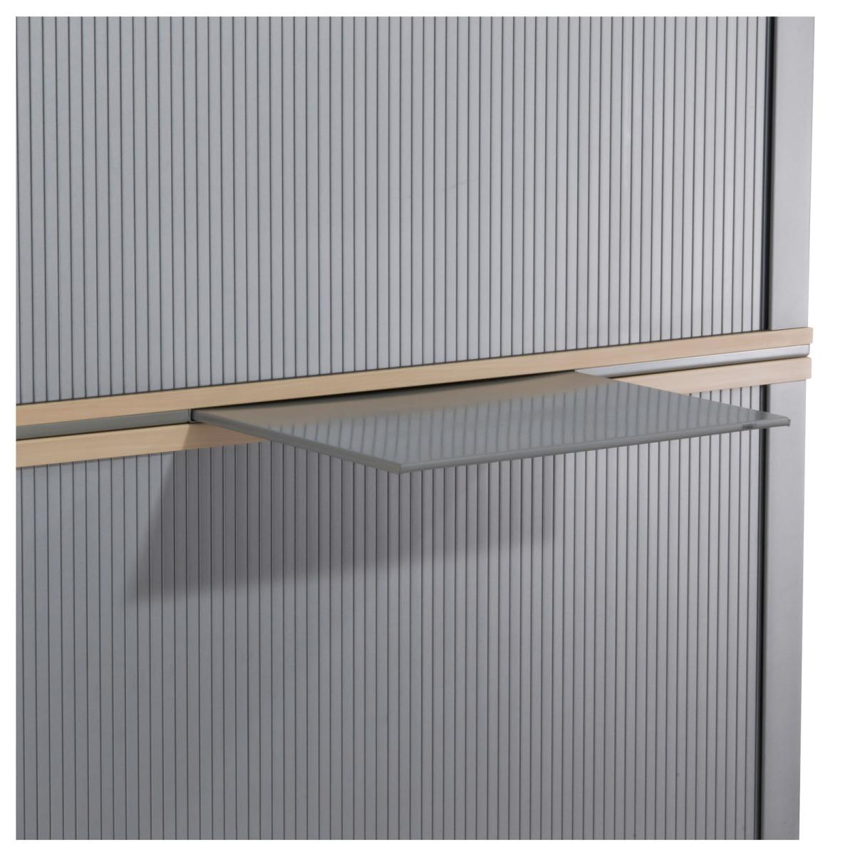 Querrollladen-Schiebtüren mit Rechtsanschlag 4 Fachböden aus Metall Fachböden höhenvariabel einsetzbar Querrollladentür mit Bügelgriff aus Metall Korpus Melaminharz beschichtet durchgehend verleimter Korpus mit hochstabiler Rückwand umlaufender Metallsockel, mit einstellbaren Stellfüßen mittiges Auszugstablar zur Ablage getrennt abschließbar, Schlüssel vorhanden |