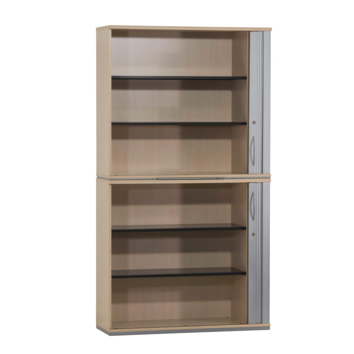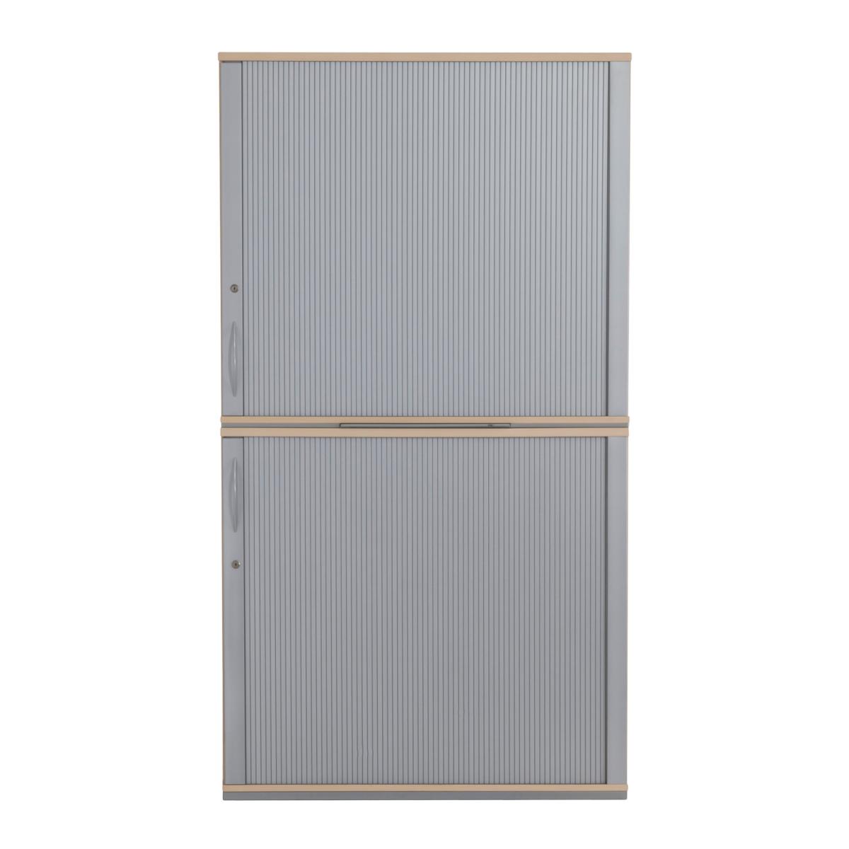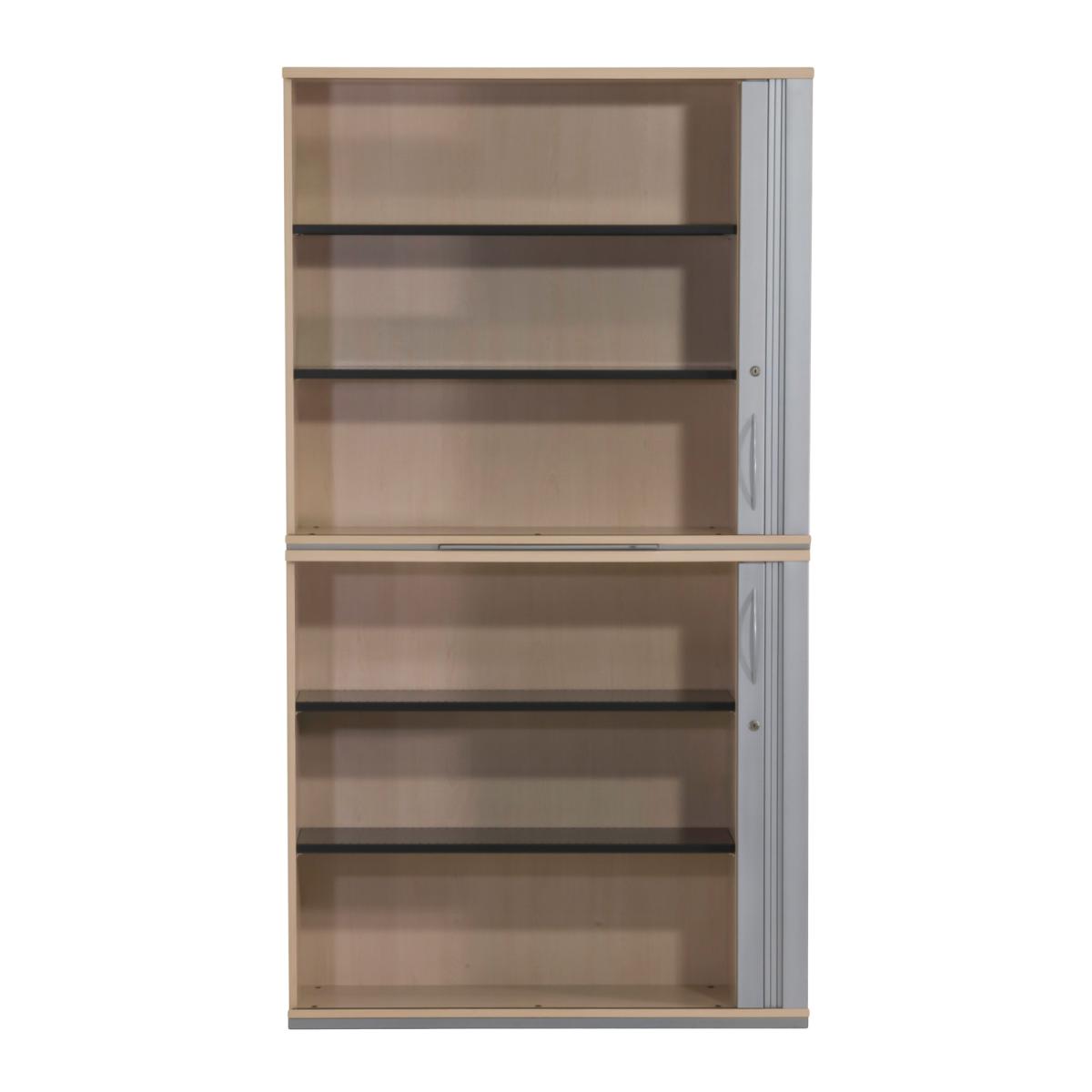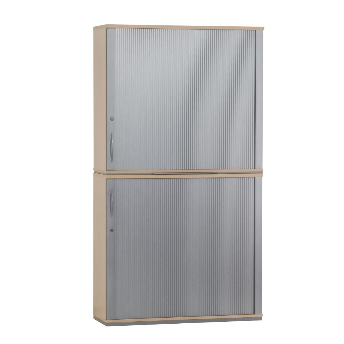 Querrollladen-Schiebtüren mit Rechtsanschlag 4 Fachböden aus Metall Fachböden höhenvariabel einsetzbar Querrollladentür mit Bügelgriff aus Metall Korpus Melaminharz beschichtet durchgehend verleimter Korpus mit hochstabiler Rückwand umlaufender Metallsockel, mit einstellbaren Stellfüßen mittiges Auszugstablar zur Ablage getrennt abschließbar, Schlüssel vorhanden |