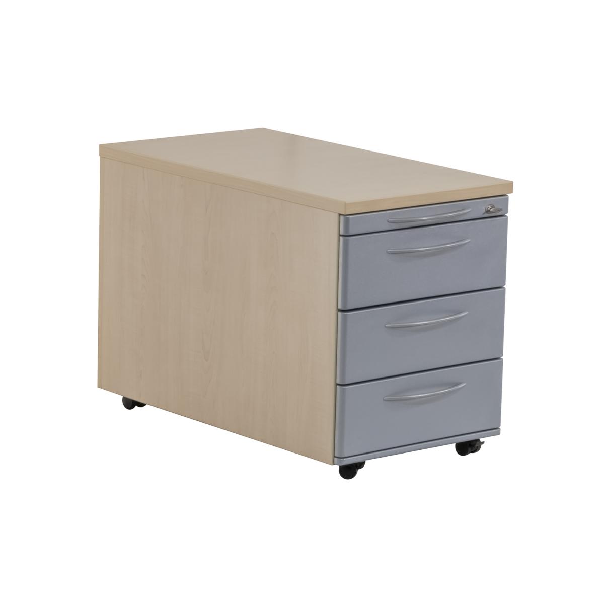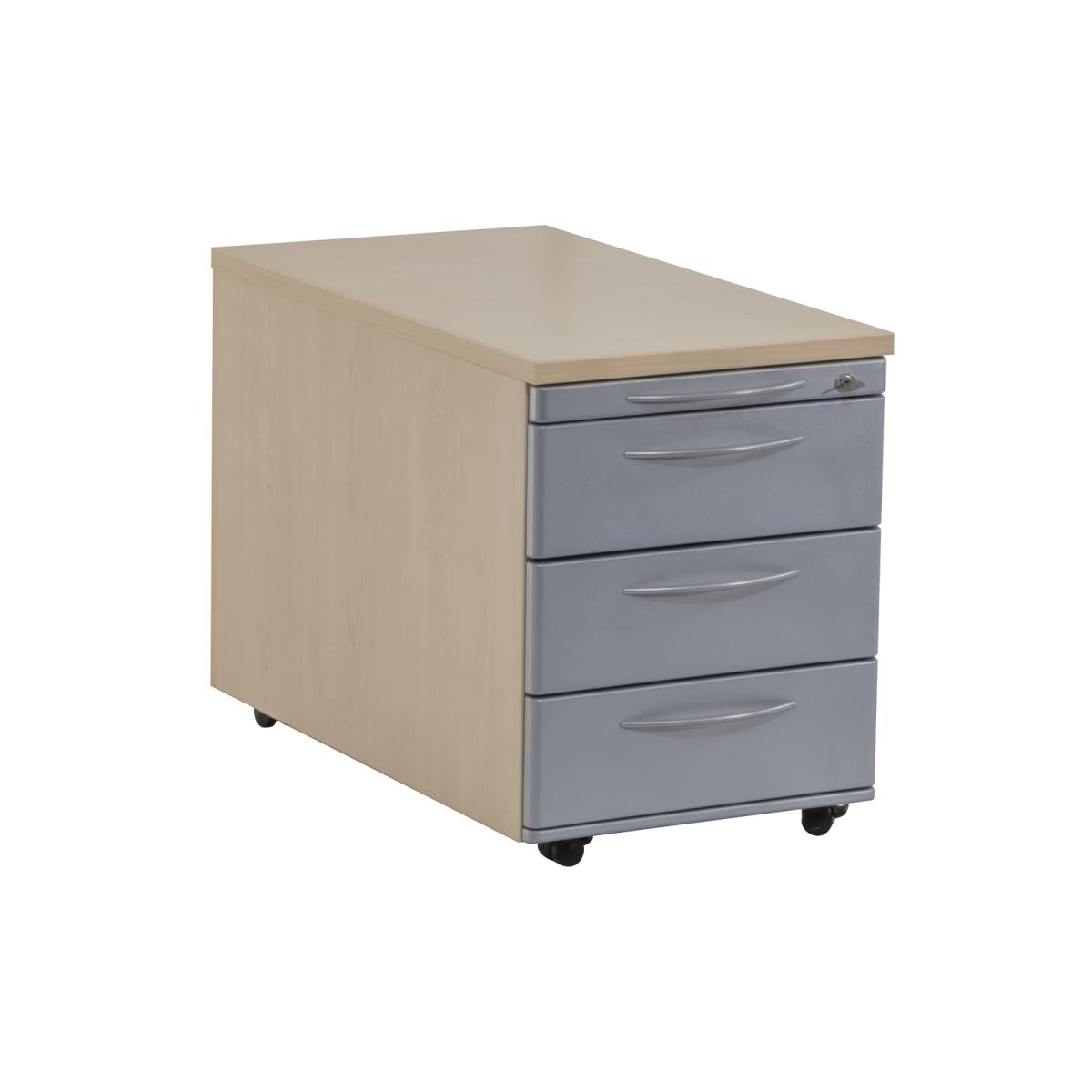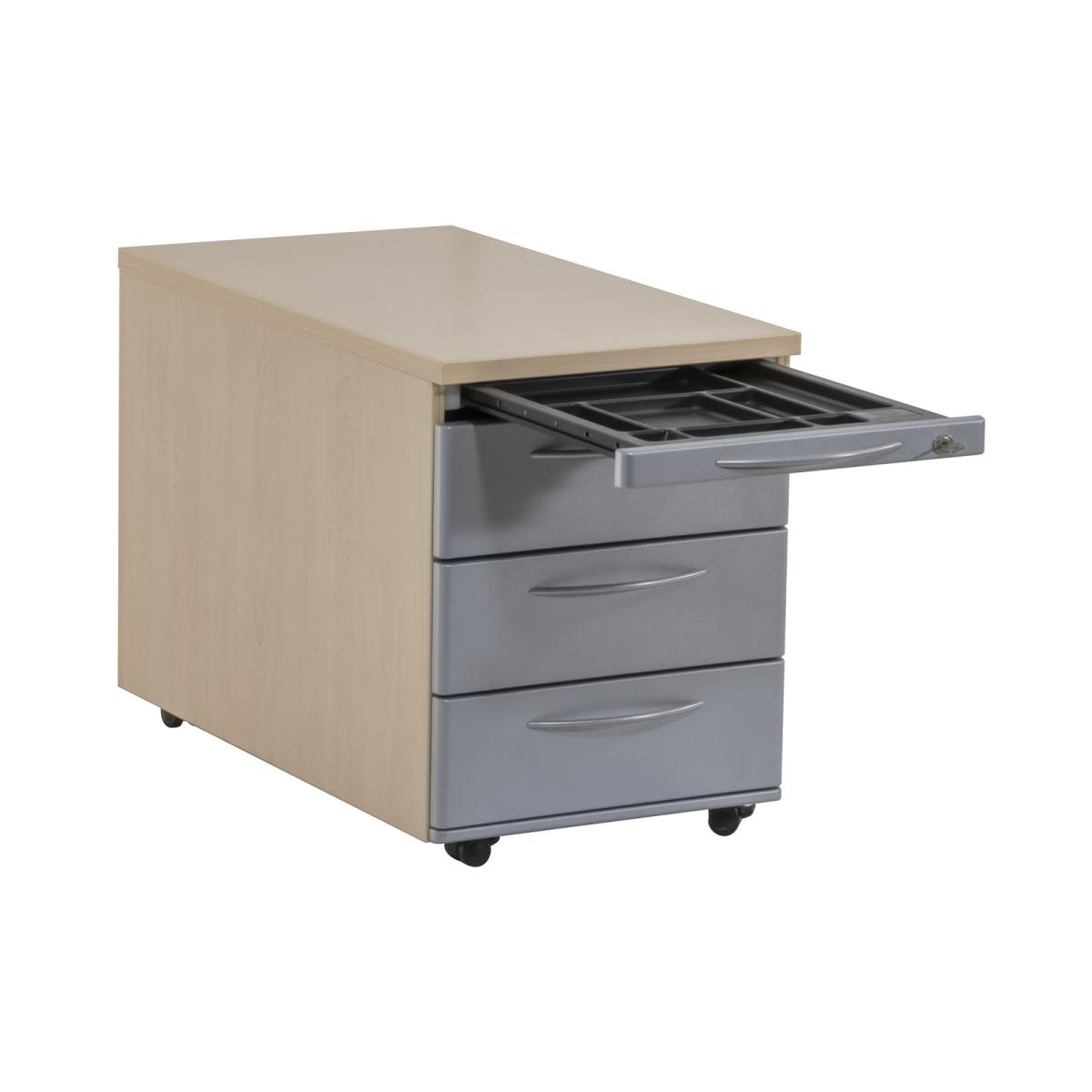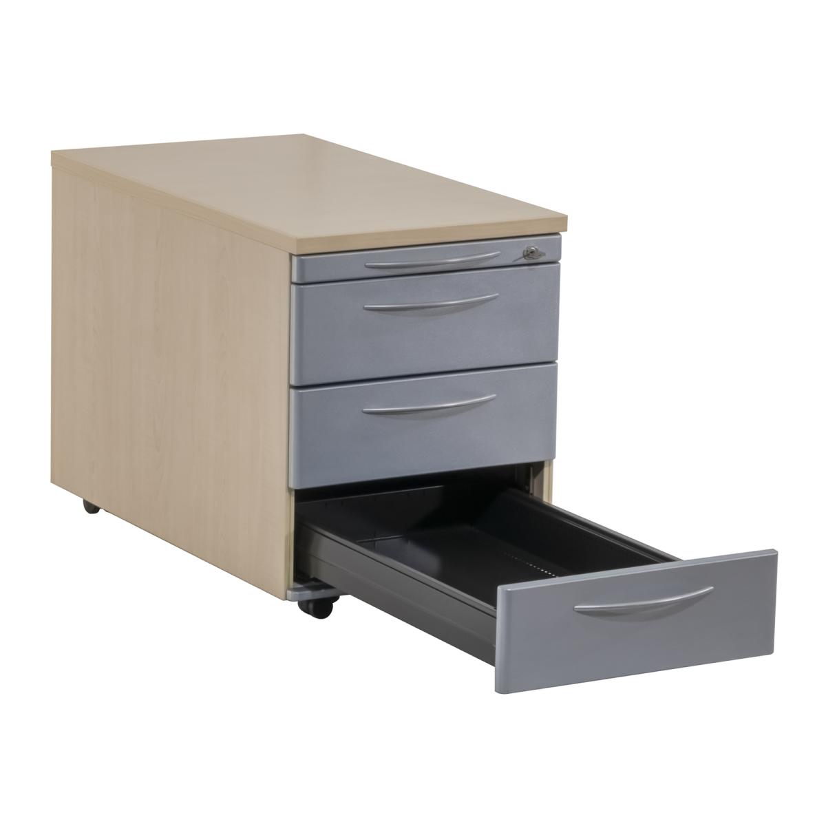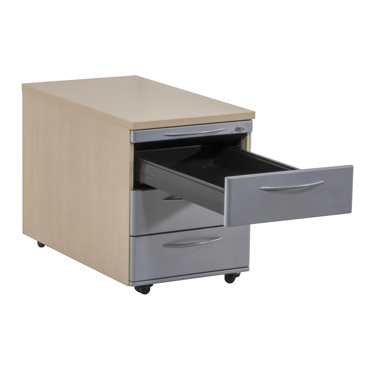 Rollcontainer mit 1-3-3-3 HE-Aufteilung 1 Marterialauszug mit Unterteilung 3 mittelhohe Schubladenauszüge Schubladenkästen aus Metall Schubladenfront mit Bügelgriff hochwertige, leichtgängige Auszugsmechanik Korpus Melaminharz beschichtet 4 Rollen abschließbar, Schlüssel vorhanden |