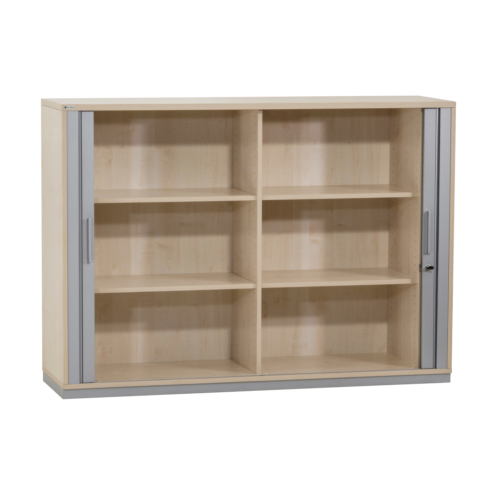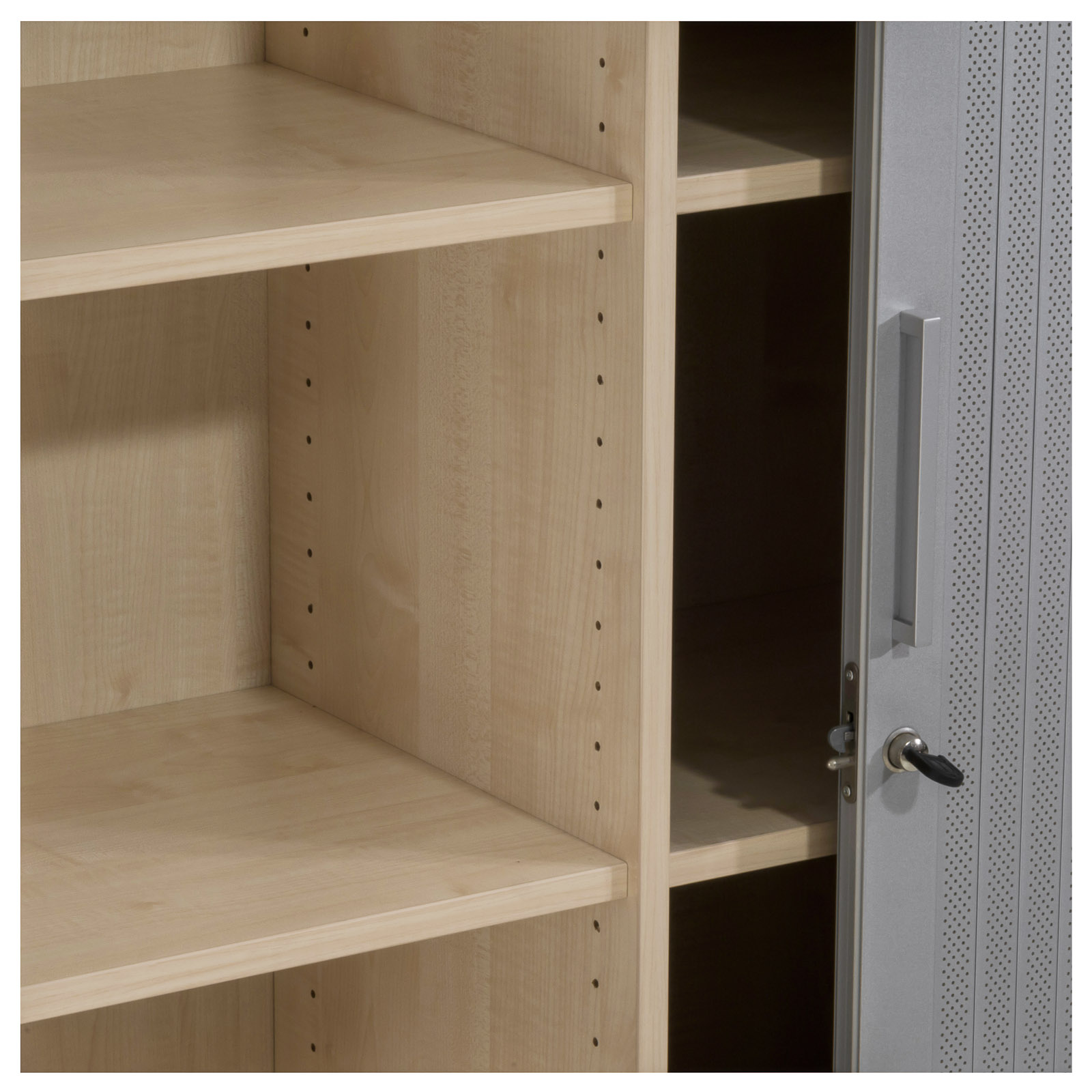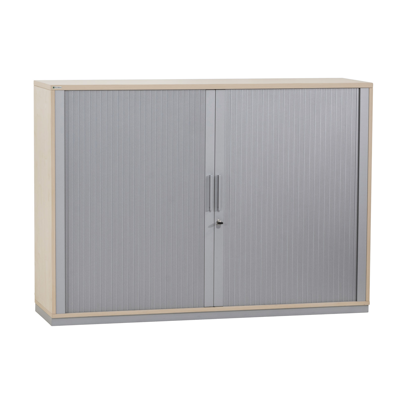 Funktionen & Eigenschaften: | Akten- / Querrollladenschrank mit 3 Aktenordner-Höhen Querrollladenschiebetür mit modernen, perforierten Akustik-Lamellen Fronten mit eleganten Steggriffen aus Metall Schrankunterteilung durch Mittelwand 4 stabile Fachböden Fachböden höhenvariabel einsetzbar hochstabile Rückwand Metallsockel mit höhenverstellbaren Bodengleitern abschließbar, Schlüssel vorhanden |