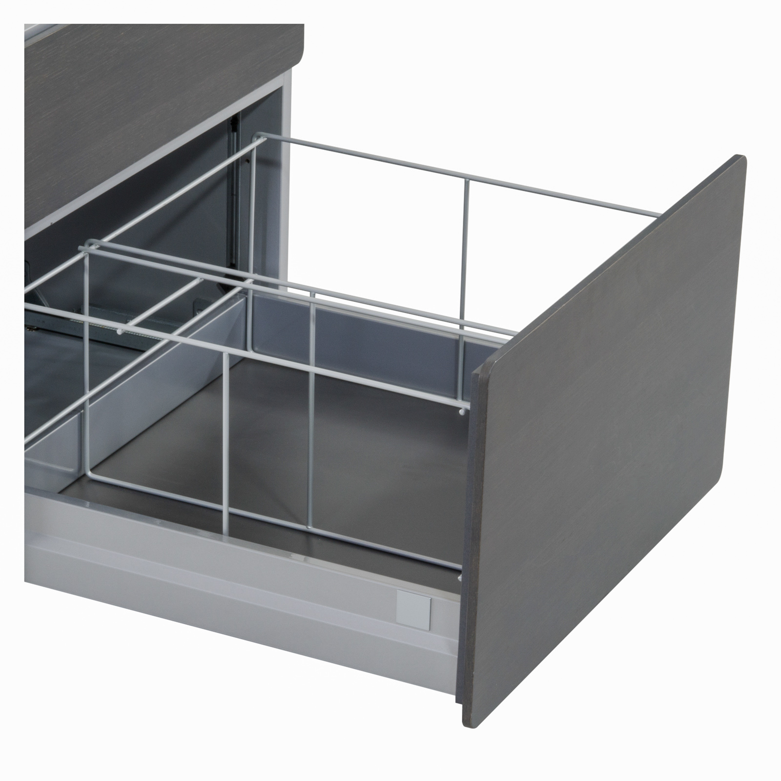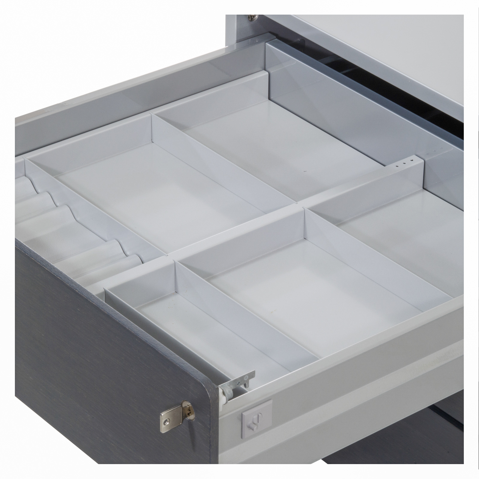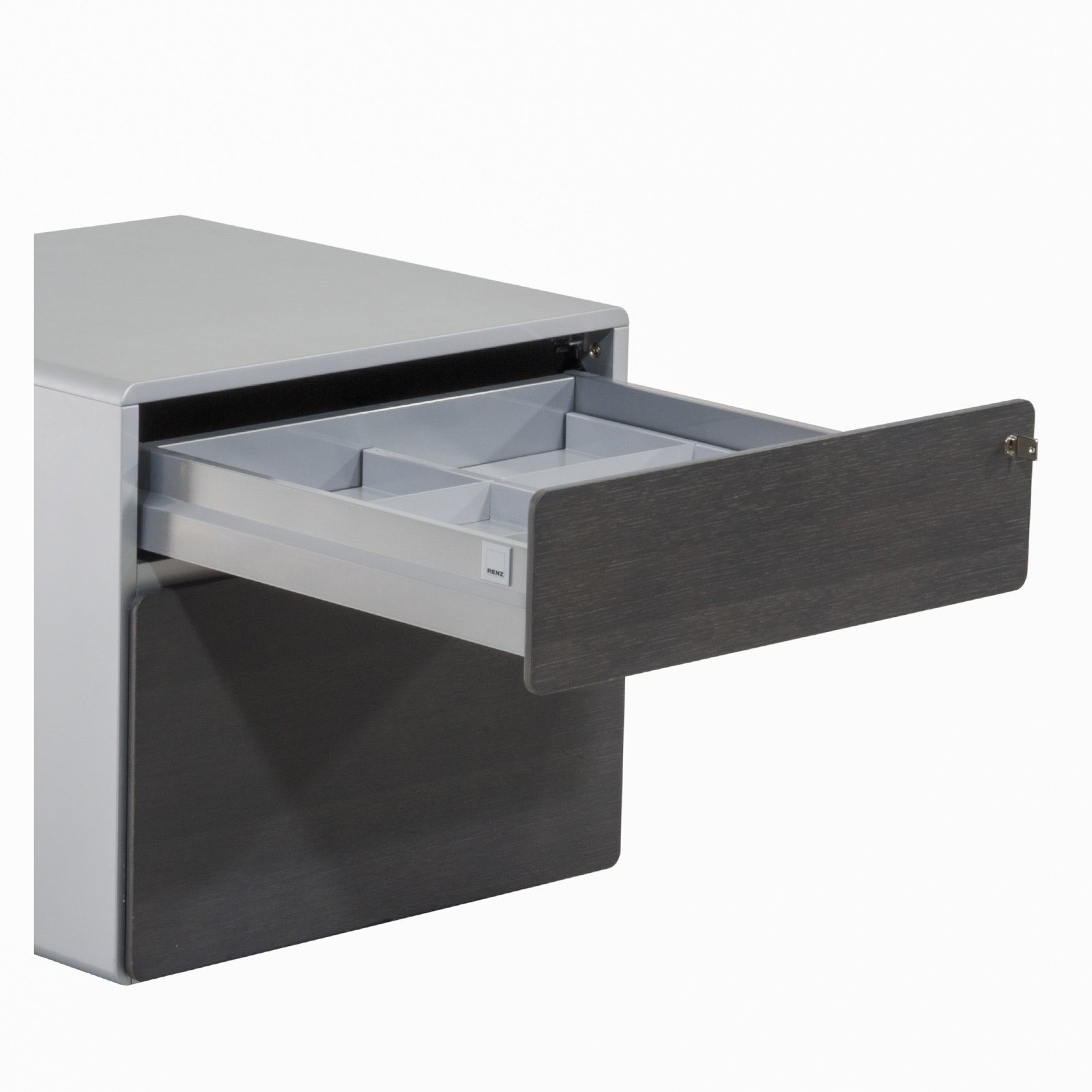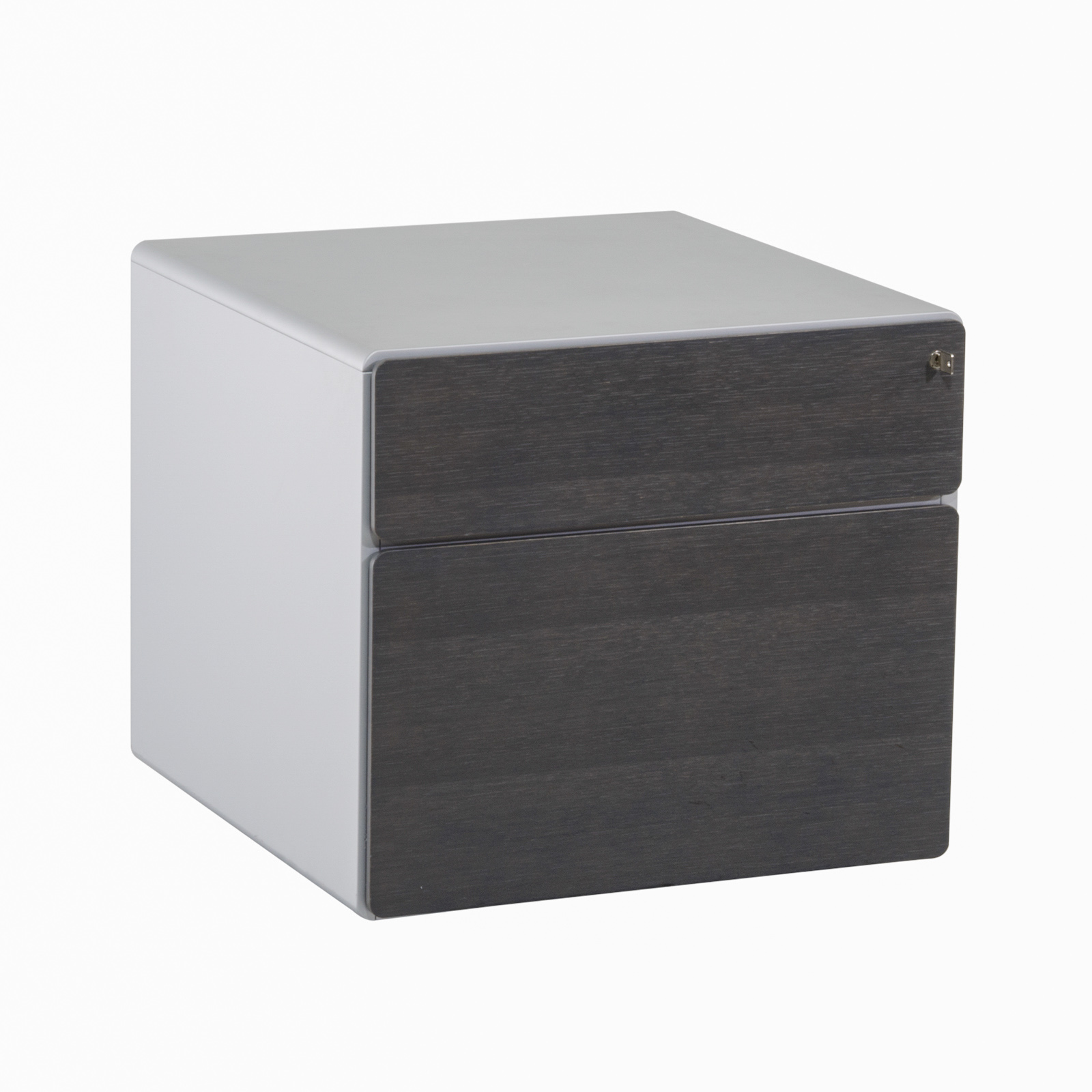 Container mit 2 Schubladenauszügen Schubladen als Vollauszüge obere Schubladen mit Fachunterteilung hohe Schublade mit herausnehmbaren Hängemappen-Korb Schubladen -Bedienung über "Touch to Open" inkl. "Soft-Close" gerundete und grifflose Fronten Fronten Echtholz furniert einstellbare Bodengleiter abschließbar, Schlüssel vorhanden |