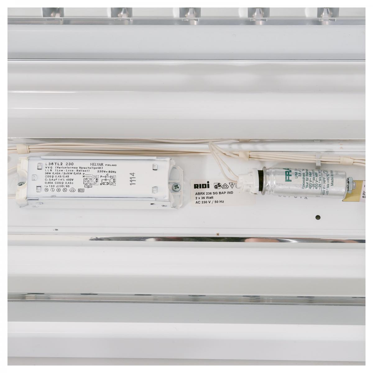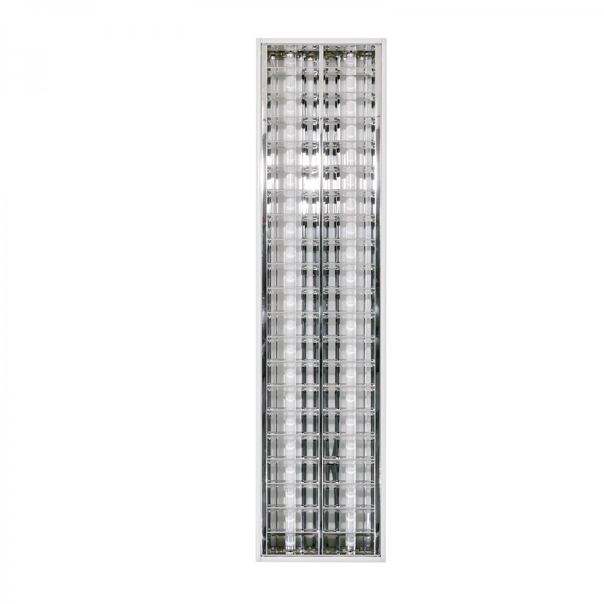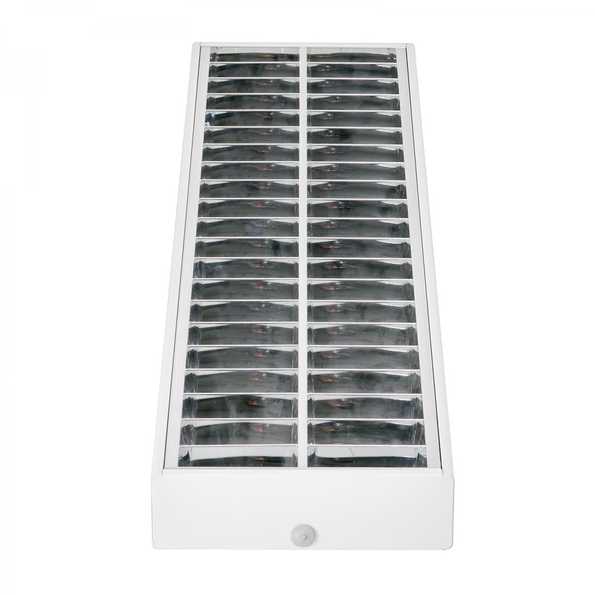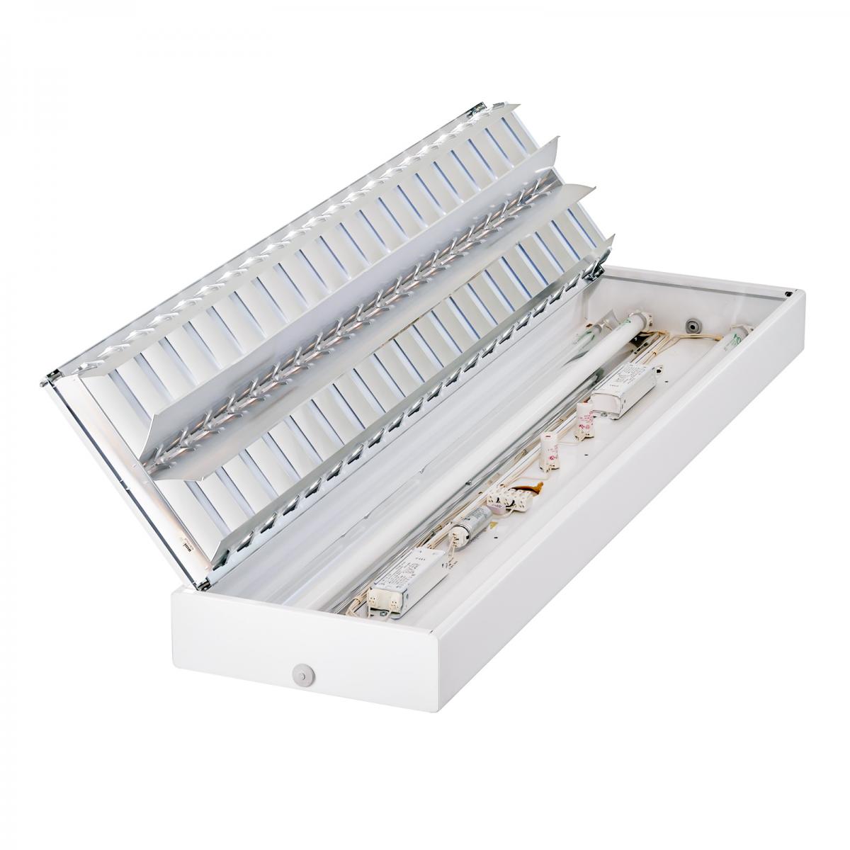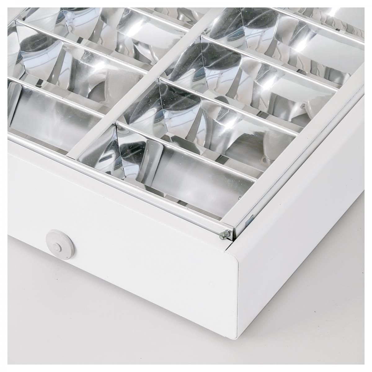 Stabiles Leuchtengehäuse mit gerundeter Längskante aus Stahl hochwertige, kratzfeste Pulverbeschichtung - Weiss Anbauleuchte für Decken- oder Pendelmontage Alu-Spiegelraster mit patentierten Riegelverschlüssen Raster hochglänzend verlustarmes Vorschaltgerät Stirnteile mit zusätzlichen Ausbrechöffnungen Fassung: G13 Energieeffizienzklasse: A+, A, B, C |