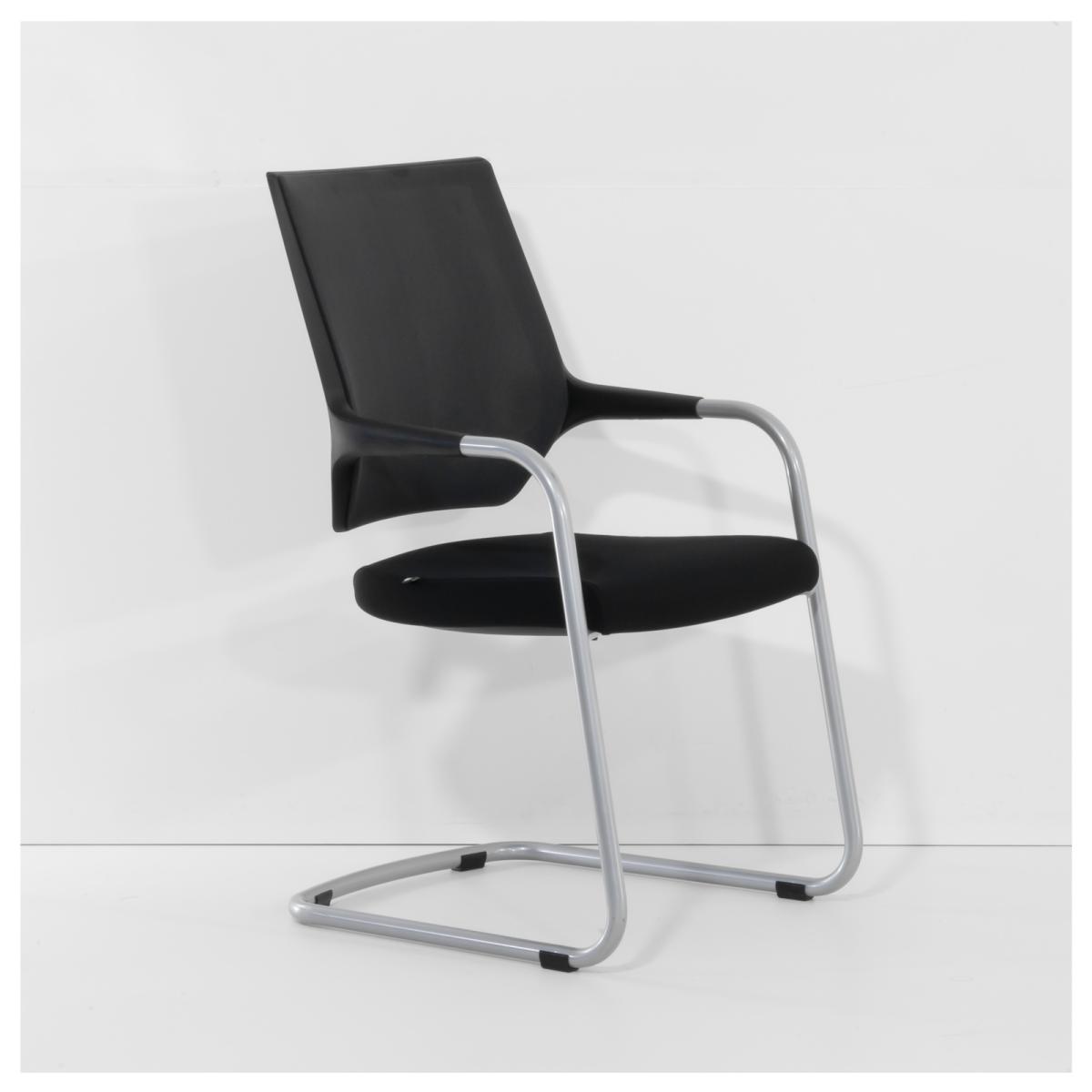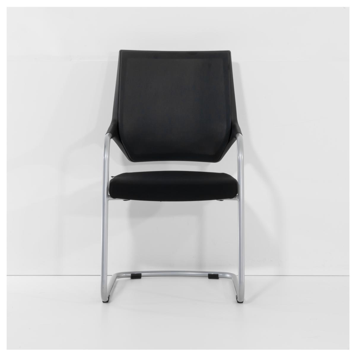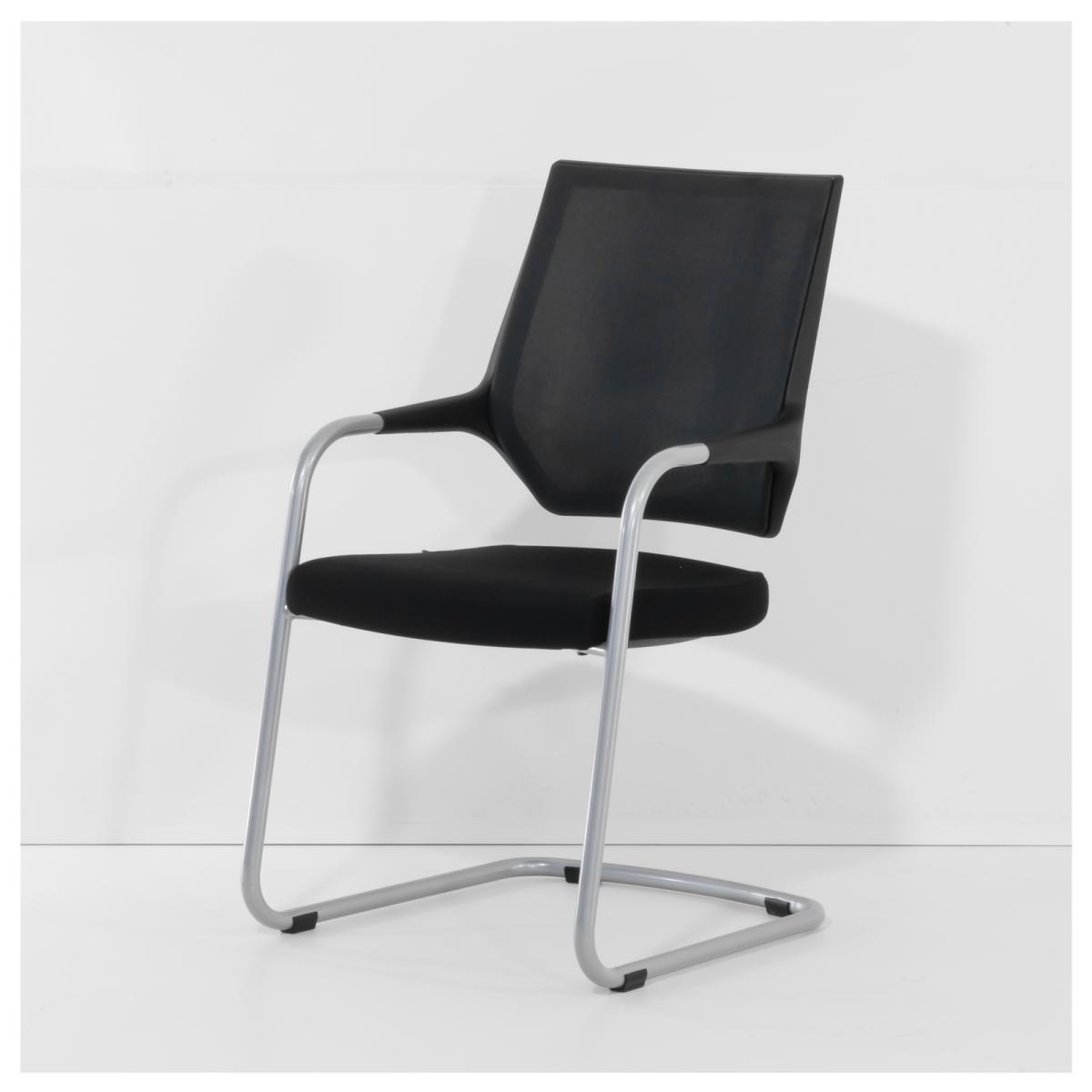 gepolsterte Sitzfläche Rückenlehnenträger mit integrierten Armauflagen aus Kunststoff Rückenlehne mit flexiblen Netzgewebe Freischwingergestell aus Stahlrundrohr hoher Sitzkomfort Bodengleiter aus Kunststoff |