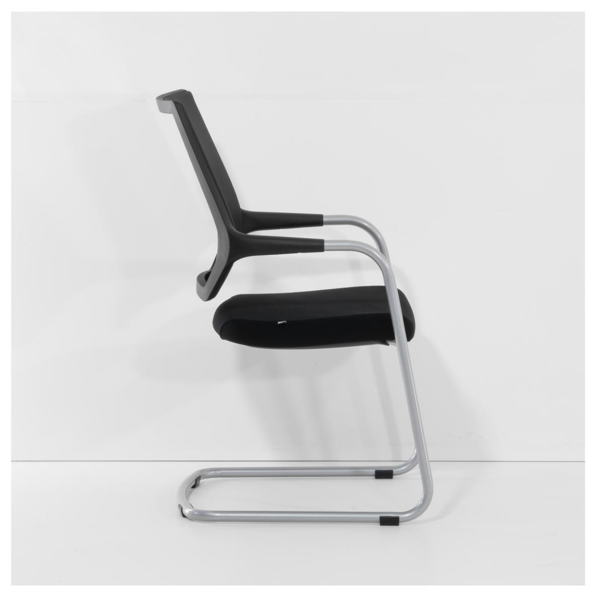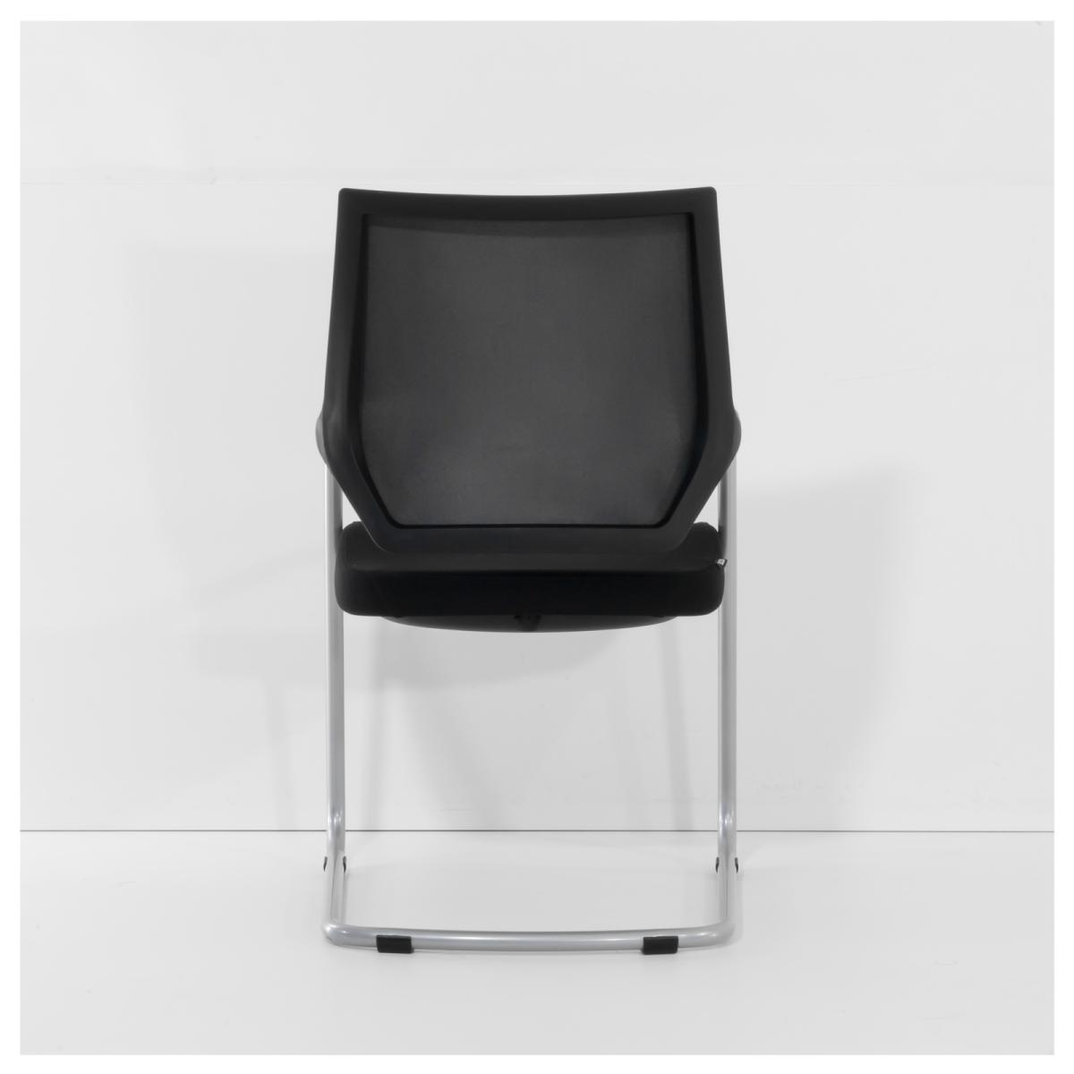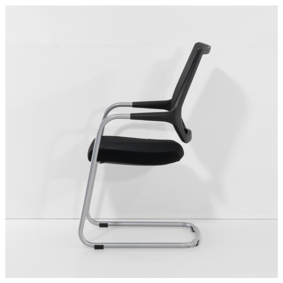 gepolsterte Sitzfläche Rückenlehnenträger mit integrierten Armauflagen aus Kunststoff Rückenlehne mit flexiblen Netzgewebe Freischwingergestell aus Stahlrundrohr hoher Sitzkomfort Bodengleiter aus Kunststoff |