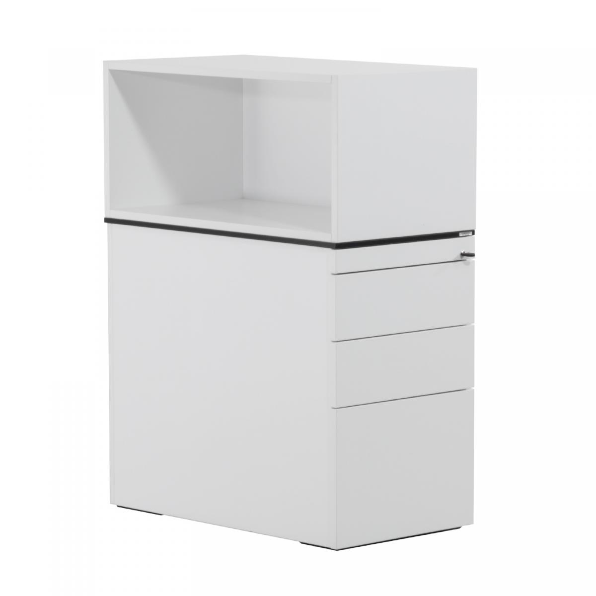 Funktionen & Eigenschaften: | Standcontainer mit Regalaufsatz 1 Material-/ Stifteauszug 2 mittelhohe Schubladenauszüge 1x hoher Schubladenauszug mit Hängeregistraturkörben (herausnehmbar) Auszüge mit glatter Front & Einzelauszugssperre Auszüge mit Metallwanne Regalaufsatz mit geschlossener Rückwand abschließbar, Schlüssel vorhanden |